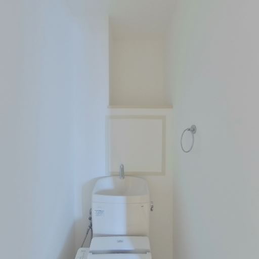 収納・棚スペースの有無(確度78%):便器正面上部にオープン棚があり、トイレ用品の収納に使えそう。