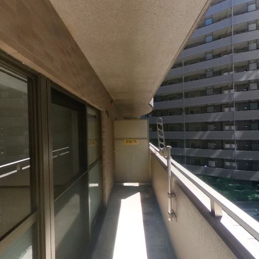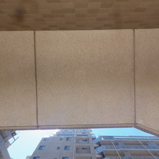 バルコニーの状態(確度62%):床や手すりに経年の汚れは見られるが大きな破損は確認できない。天井に小さな汚れ跡。