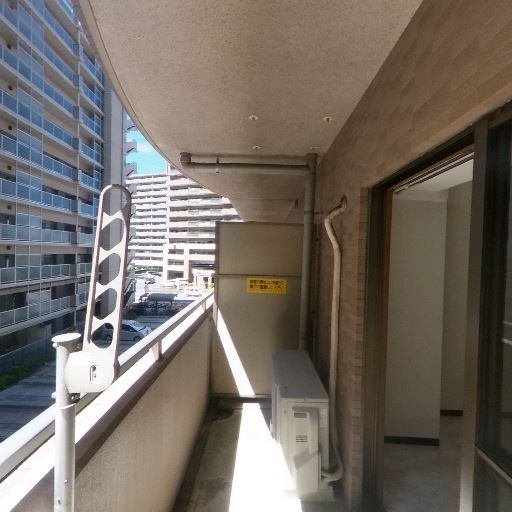 バルコニーの広さと使い勝手(確度70%):人が通れる奥行きがあり、室外機設置済み。物干し金具があり洗濯物を干せる。
