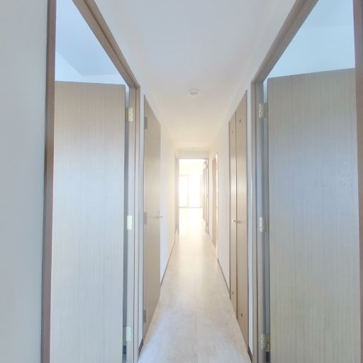 廊下の採光(確度83%):玄関から伸びる廊下の突き当たり側に窓か開口部があり、自然光が差し込んでいる。廊下自体は細めだが明るい印象。