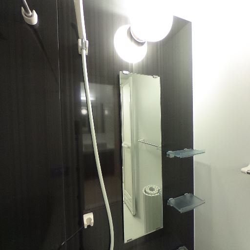 • 浴室の設備が新しめ(確度78%):ダークパネルの壁面に縦長ミラーとガラス棚、シャワースライドバーがあり、全体的に清潔感がある。
