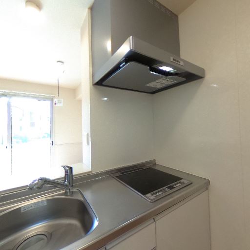 • コンロはIH・レンジフードは新しめ(確度86%):2口のIHクッキングヒーターとステンレスシンク、大型のレンジフードが見える。
