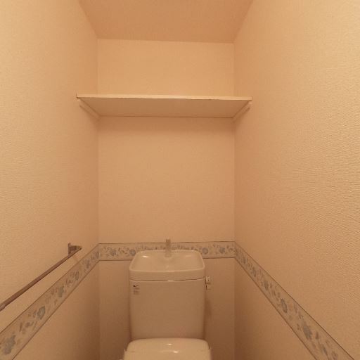 • トイレ上部の収納棚(確度96%):便器の上に固定式の棚が設けられており、トイレットペーパーや掃除用品を置ける収納スペースがある。