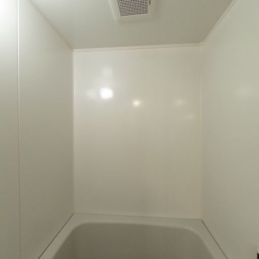 • 浴室全体がシンプルで清潔感のある印象(確度83%):壁・浴槽ともに白を基調としており、目立つ汚れや大きな傷は画像上では確認しにくい。ユニットバスとして標準的だが、全体として整理された状態に見える。