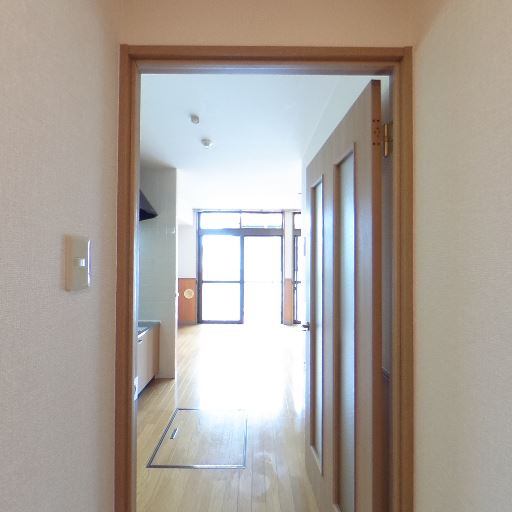 • LDK側の採光が良い(確度92%):廊下の先の居室側に大きな開口部があり、強い自然光が入っている様子が確認できる。玄関側まで明るさが届いており、室内全体の印象は比較的明るい。