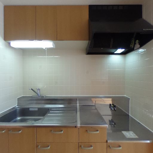 • キッチン設備がコンパクトにまとまっている(確度89%):シンク、作業台、加熱機器、レンジフード、吊戸棚が一列に配置された壁付けキッチンで、必要な設備が一通りそろっている。