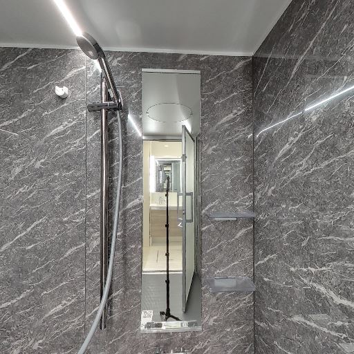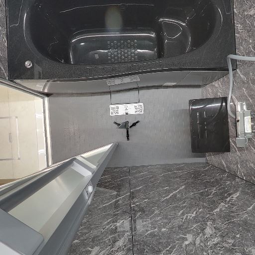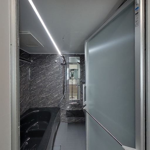 • 浴室全体の質感が高い(確度86%):壁面は石目調パネルで統一され、黒の浴槽と合わせて高級感がある。