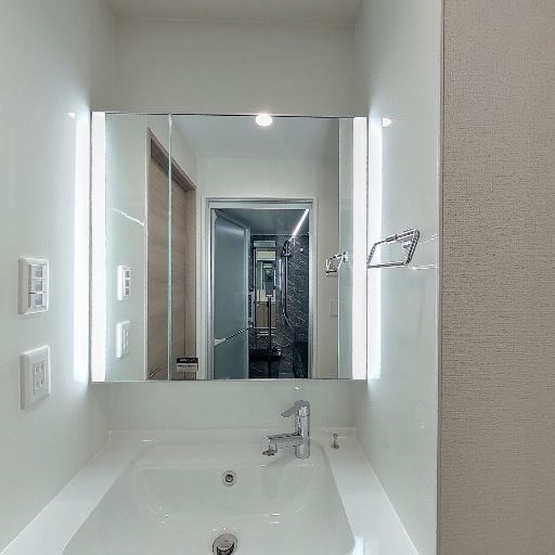• 洗面台の照明付き三面鏡(確度88%):縦型のビルトイン照明が付いた三面鏡で、手元が明るく使い勝手が良さそう。