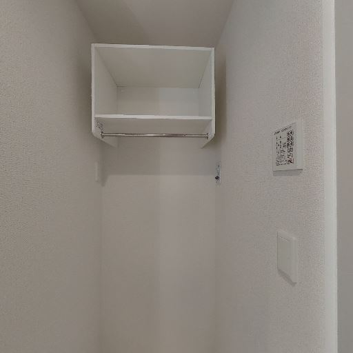 • 洗濯機置き場あり(確度90%):床面に洗濯機パンと排水口があり、上部に棚とハンガーバーも設置されている。