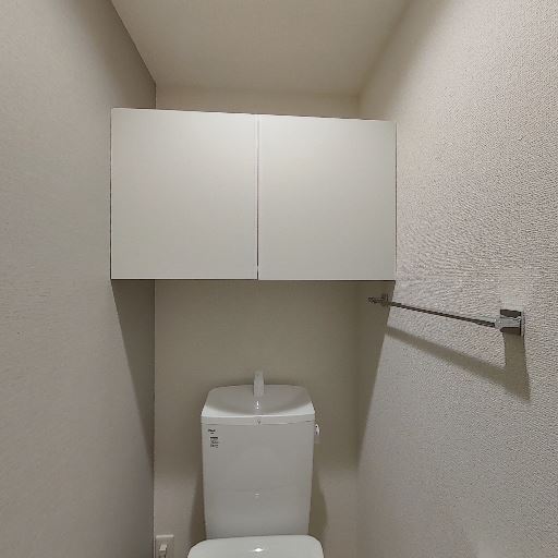 • トイレ上部に収納あり(確度90%):便器上に観音開きの吊り戸棚があり、トイレットペーパーや掃除用品を収納できそう。