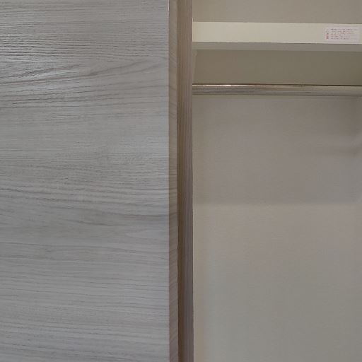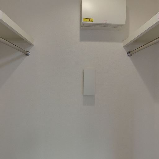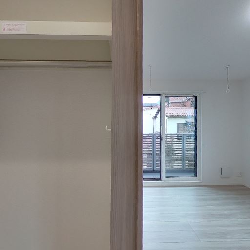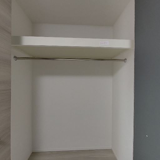 • クローゼットの収納(確度86%):ハンガーパイプと上部棚のあるオープンクローゼットがある。奥行きは標準的で床もきれい。