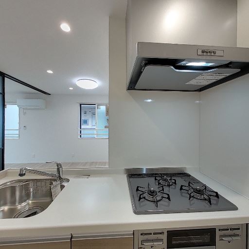 • 対面キッチンと三口コンロ(確度90%):シンクとコンロが一体のカウンターで、三口ガスコンロと大きめのレンジフードが見える。対面側にリビングスペースが続いている。