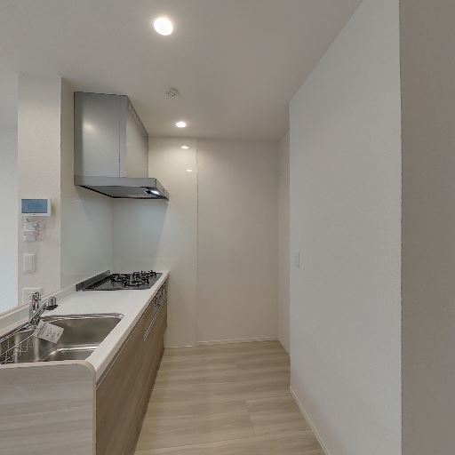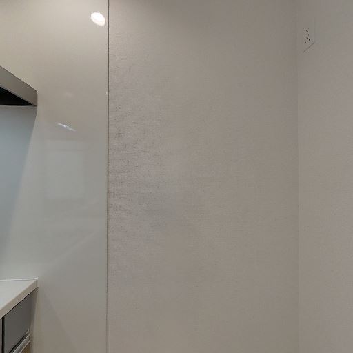 • キッチン脇の壁保護パネル(確度83%):コンロ横に光沢のある耐熱パネルがあり、油跳ね対策がされている。