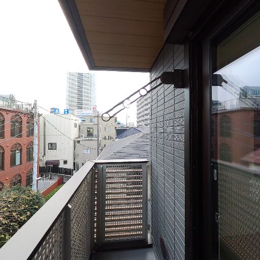 • バルコニーあり・物干し金具付き(確度90%):細長いバルコニーに物干し金具と手すりが確認できる。洗濯物を外干しできる環境。