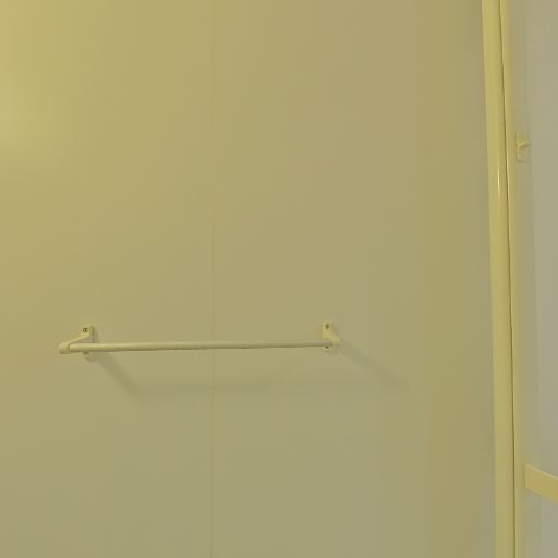 タオル掛けあり(確度86%):右壁面にタオルバーが設置されている。