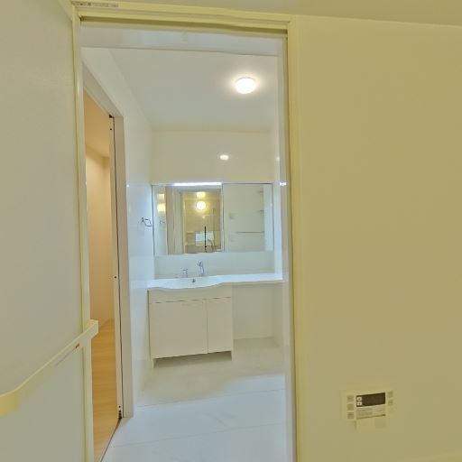 浴室が隣接・新しめの印象(確度78%):洗面室から直接アクセスできる浴室が見え、壁面パネルなど全体的に清潔感のある新しめの設備に見える。