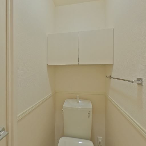 トイレ上部の収納キャビネット(確度90%):便器正面の上部に開き戸の吊り戸棚があり、トイレットペーパーや掃除用品を収納できる。