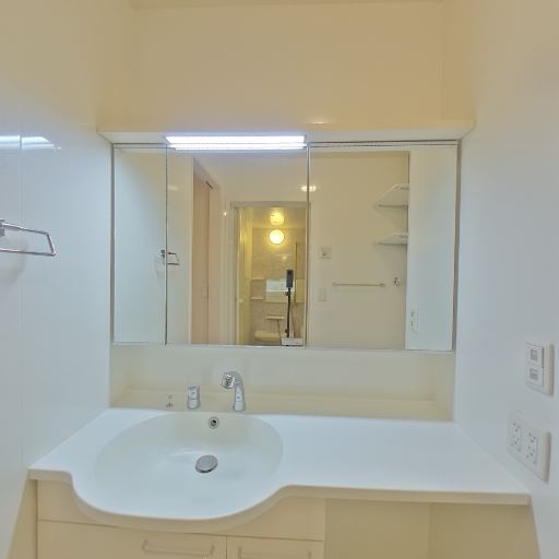 独立洗面台と三面鏡収納(確度90%):広めのカウンター付きの独立洗面台。三面鏡の裏に収納があり、照明も付いている。