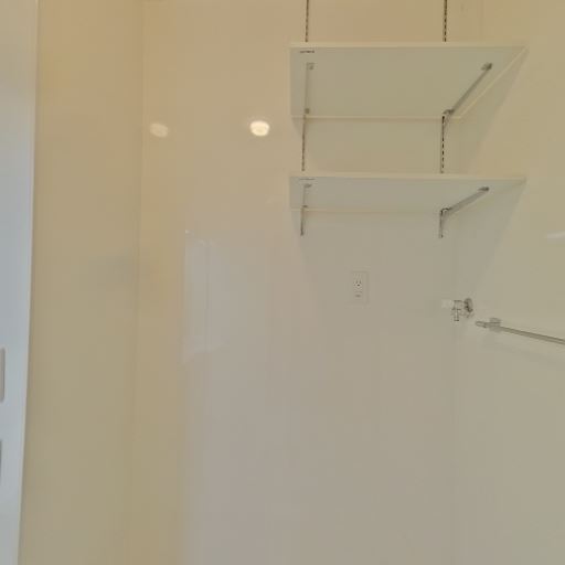 可動棚とタオルバー(確度82%):壁面に2段の棚とタオルバーがあり、日用品やタオルを置ける。