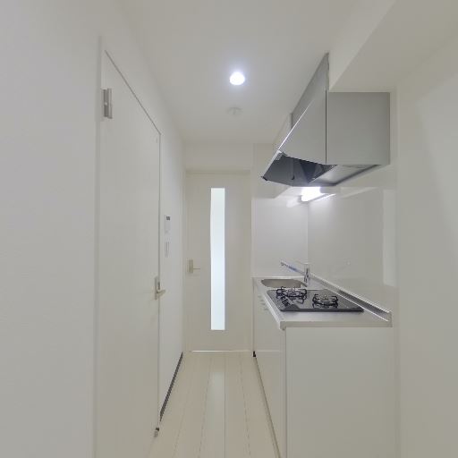 キッチンが隣接(確度74%):洗面・脱衣スペースのすぐ向こうに2口コンロのキッチンが見える。