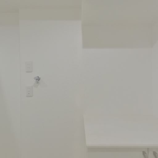 収納・洗濯機置き場の可能性(確度72%):壁面に給水栓とコンセントがあり、カウンター脇に洗濯機置き場が想定される。床面の排水口らしきものも見える。