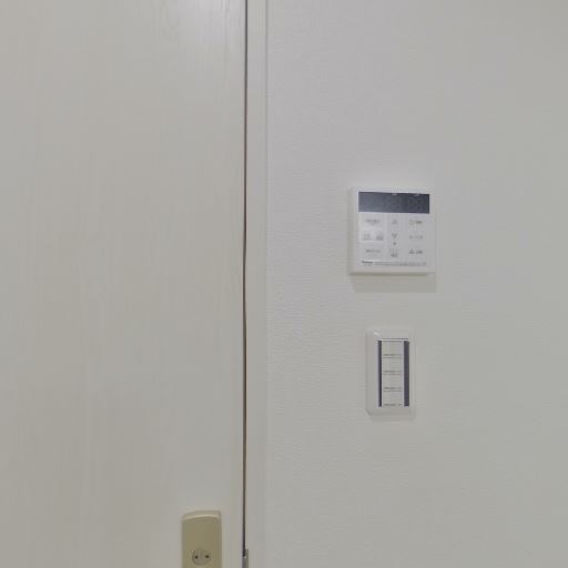 室内設備の操作パネルあり(確度78%):壁に給湯・換気等の操作パネルとスイッチが整然と配置されている。