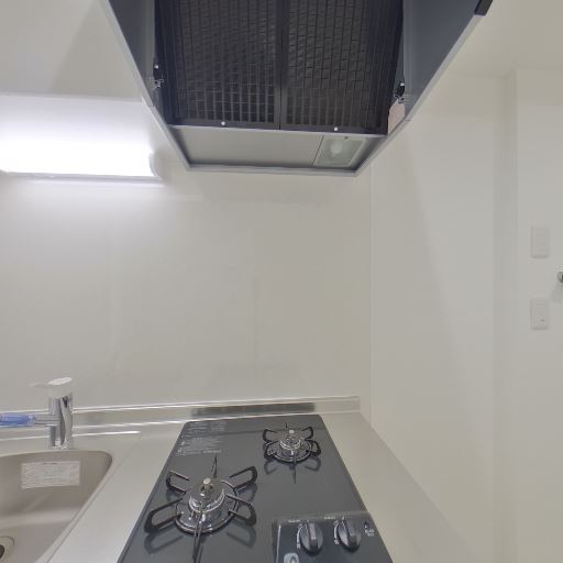 キッチン設備(2口ガス&レンジフード)(確度86%):壁付けのスリムキッチンに2口ガスコンロと大きめのレンジフード、シンクが確認できる。手元灯もあり調理しやすそう。