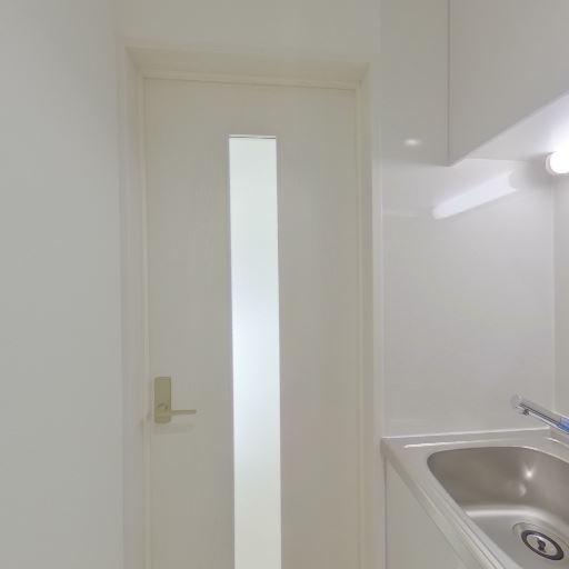 採光面(縦長のガラス付ドア)(確度64%):キッチン奥にスリットガラス入りのドアがあり、廊下や外からの光を取り込める。室内全体は白基調で光を反射し明るい。