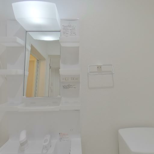 独立洗面台と収納棚(確度90%):鏡付きの独立洗面台があり、左右に小棚が複数設置されている。洗面上部には照明もある。