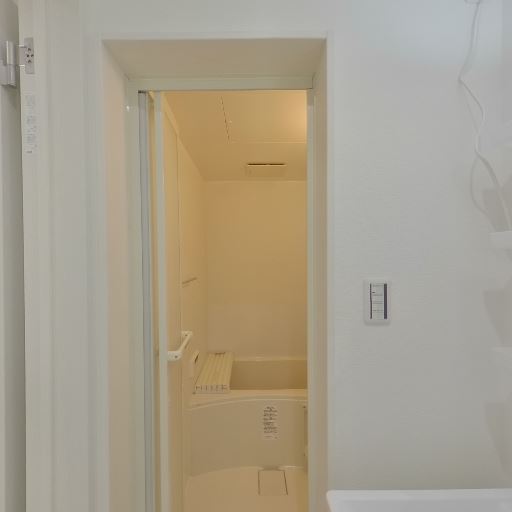 浴室の出入口動線(確度73%):浴室ドアの先に洗面・トイレ側のスペースが見え、脱衣所と隣接している。