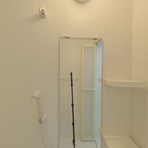 浴室設備(鏡・棚・シャワー)(確度88%):縦長ミラー、コーナー棚、ハンドシャワーが備わっている。
