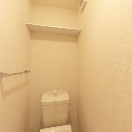 トイレ上部の収納棚がある(確度95%):トイレ奥の上部に棚が設置されており、トイレットペーパーや掃除用品の収納に使えそうです。