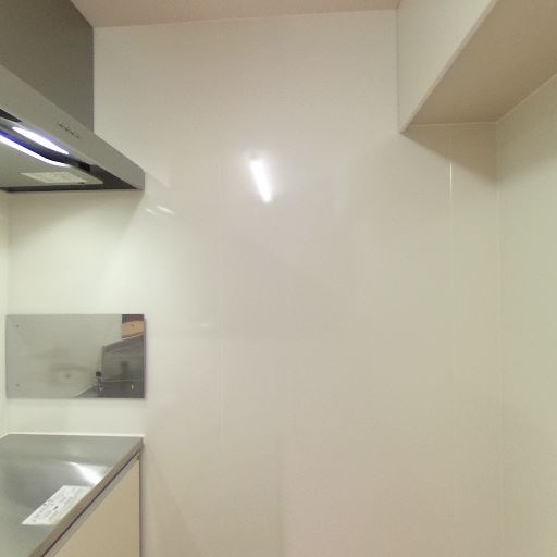 キッチン周辺に収納・作業補助スペースがある(確度80%):壁側に吊戸棚または棚板状の収納が見え、足元側にも収納キャビネットがある。さらに別面にはカウンター状の台も確認できる。
