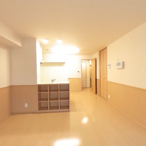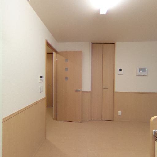 室内は明るく清潔感がある(確度86%):壁・床・建具が明るい色味で統一され、天井照明も点灯していて全体的に明るい印象を受ける。目立つ汚れもこの範囲では見当たらない。