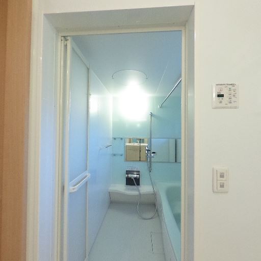 浴室乾燥・換気設備がありそう(確度80%):天井に換気口が確認でき、浴室乾燥または換気機能付きの設備がある可能性が高い。入口付近には操作パネルらしきものも見える。