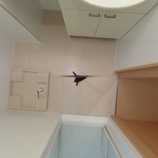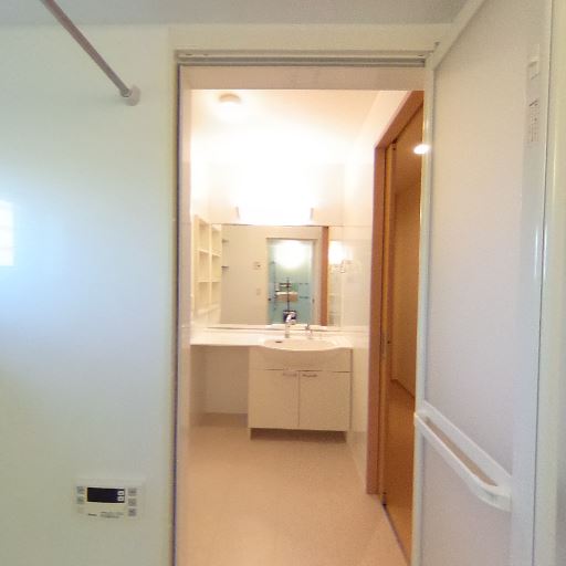 浴室から洗面所への動線がよい(確度89%):浴室の出入口の先に洗面台が見えており、脱衣・洗面スペースとのつながりがスムーズな間取りに見える。