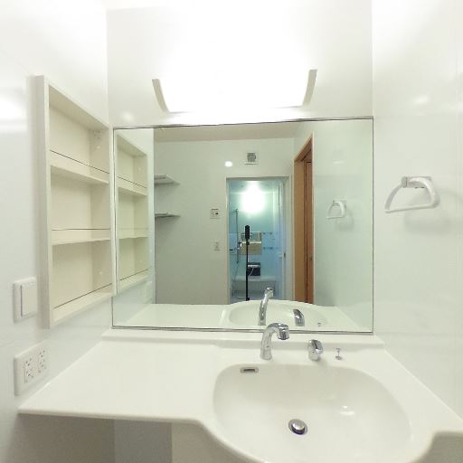 洗面台まわりの収納が充実している(確度93%):鏡横の可動棚と洗面台下収納があり、洗面用品やストック類を整理しやすい構成に見える。
