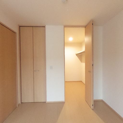 収納スペースが確保されている(確度89%):正面にクローゼット扉があり、さらに開放されたウォークイン風の収納スペースも見えている。