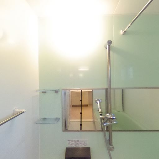 鏡と棚付きで使い勝手がよさそう(確度93%):洗い場側に縦長のミラーと小さな棚、シャワー金具が設置されており、日常利用に必要な機能がまとまっている。