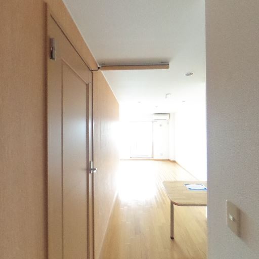 廊下から居室への抜け感(確度73%):玄関側から先に明るい居室が見え、奥に大きな開口(バルコニー窓とエアコン)があり採光が期待できる。