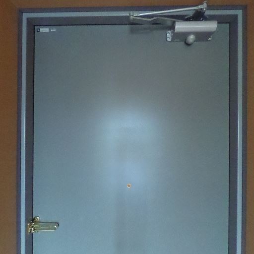 玄関ドアとドアクローザー(確度86%):金属製の玄関ドアにドアクローザーとドアスコープ、内側サムターン・ドアガードが確認できる。