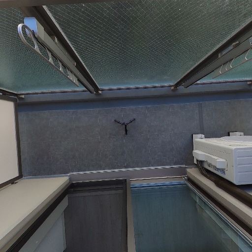 室内洗濯機置き場がある(確度94%):廊下の一角に防水パンと給水・排水口が確認できる。