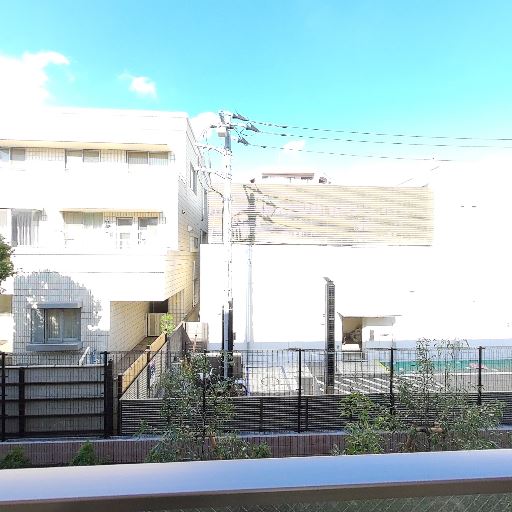 バルコニーからの抜け感(確度78%):前方は低層の建物と道路・フェンスで、視界が比較的開けている。圧迫感は少ない。