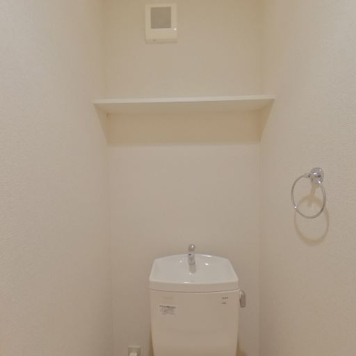 • 収納棚とタオルリングあり(確度90%):便器背面上部に小棚、側面にタオルリングが設置されている。