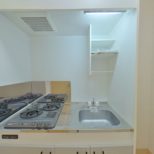• 2口ガスコンロとミニシンクのキッチン(確度84%):コンロが2口で魚焼きグリル付きに見える一方、シンクは小さめで作業スペースも限られる。上部に換気扇とオープン棚あり。