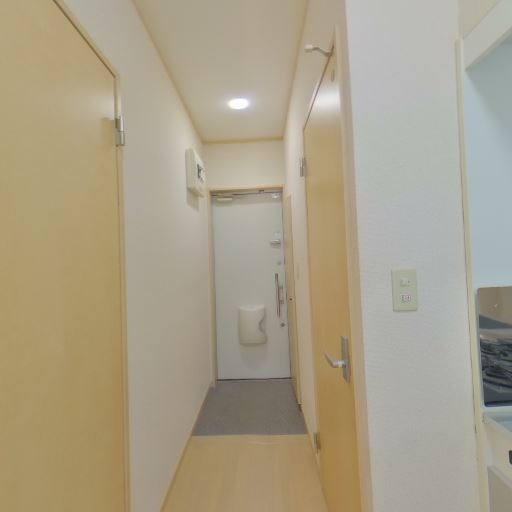 • 照明と分電盤の位置(確度74%):天井にダウンライト系の照明があり、壁面に分電盤が設置されている。廊下は十分に明るい。