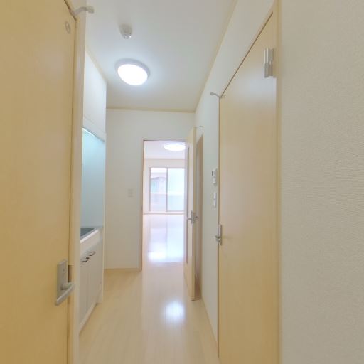 • 玄関からの一直線の廊下(確度86%):天井ダウンライト付きの細長い廊下で、玄関ドアが見える。