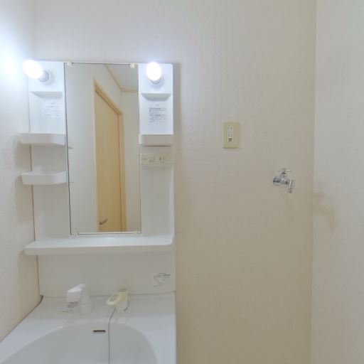 • 独立洗面台と照明付きミラー(確度86%):洗面台にミラーキャビネットと左右の照明、小物棚があり使い勝手が良さそう。