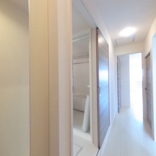 • 浴室と洗面脱衣所が隣接(確度86%):引き戸の先に洗面脱衣スペースと洗濯機置き場が見える配置。