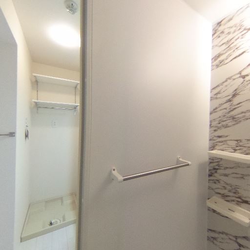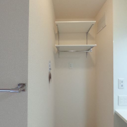 • ランドリー収納とタオル掛け(確度78%):可動棚とハンガーバーがあり、タオルや洗剤を置ける。壁面にタオルバーも見える。